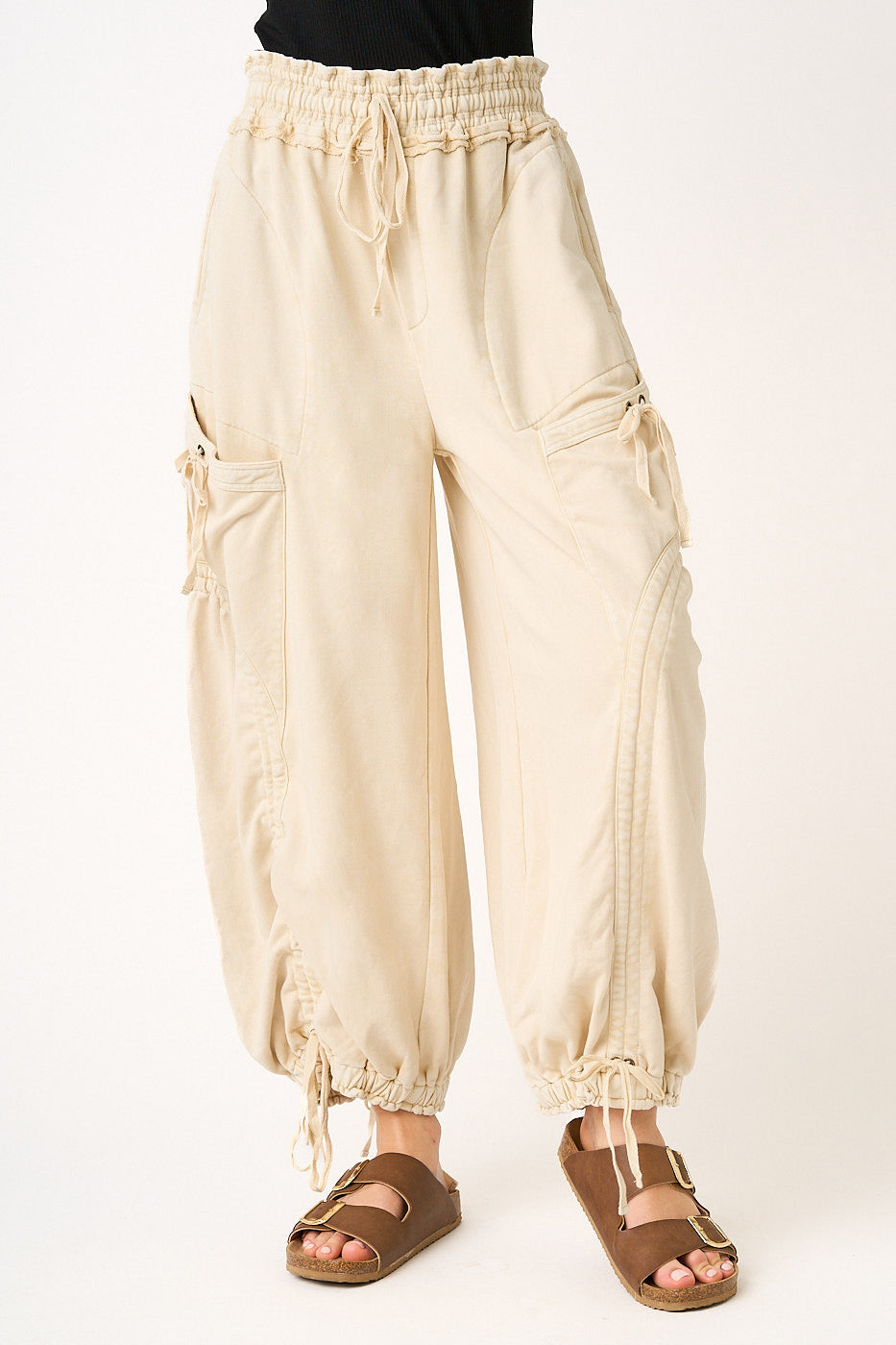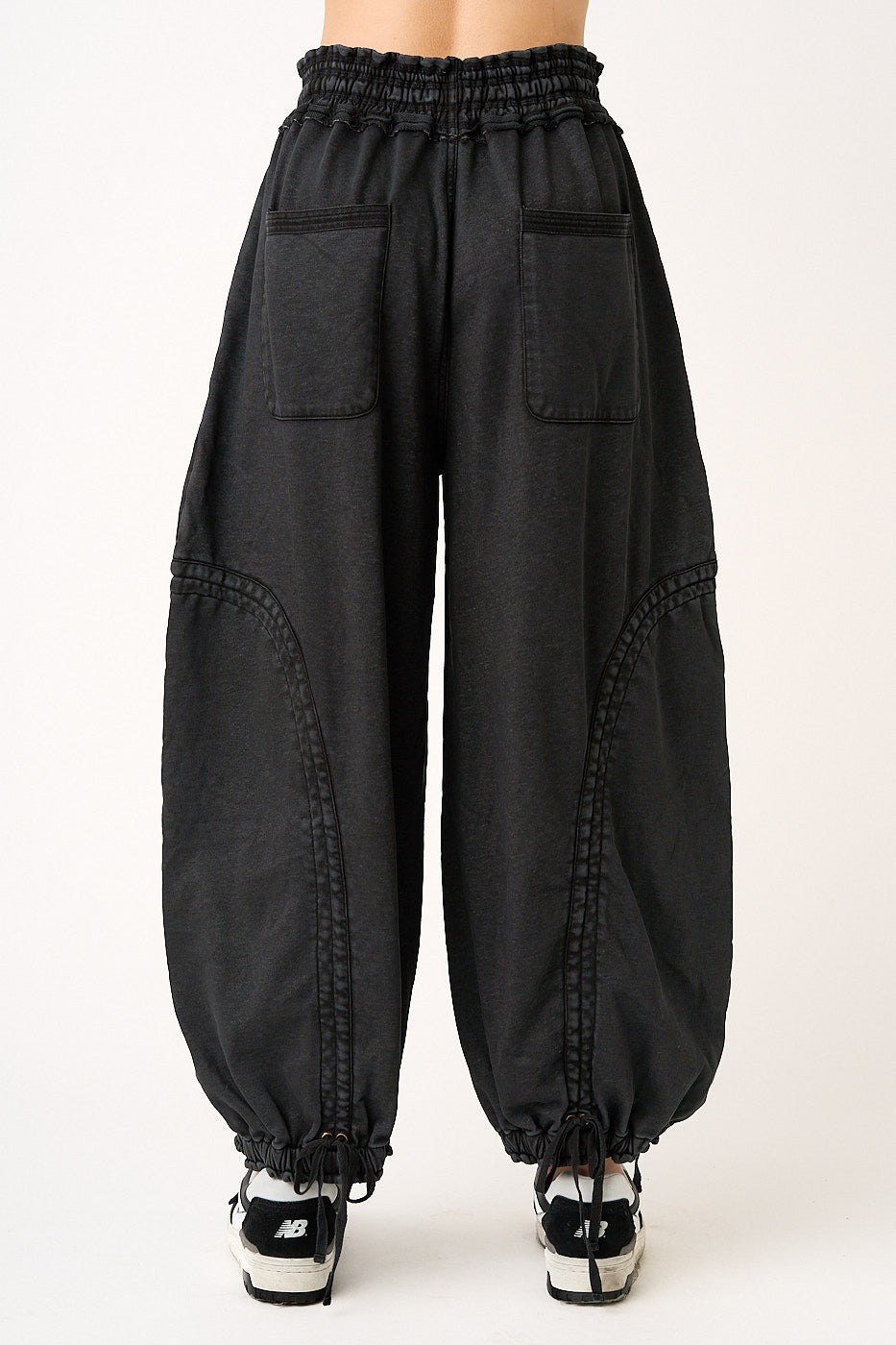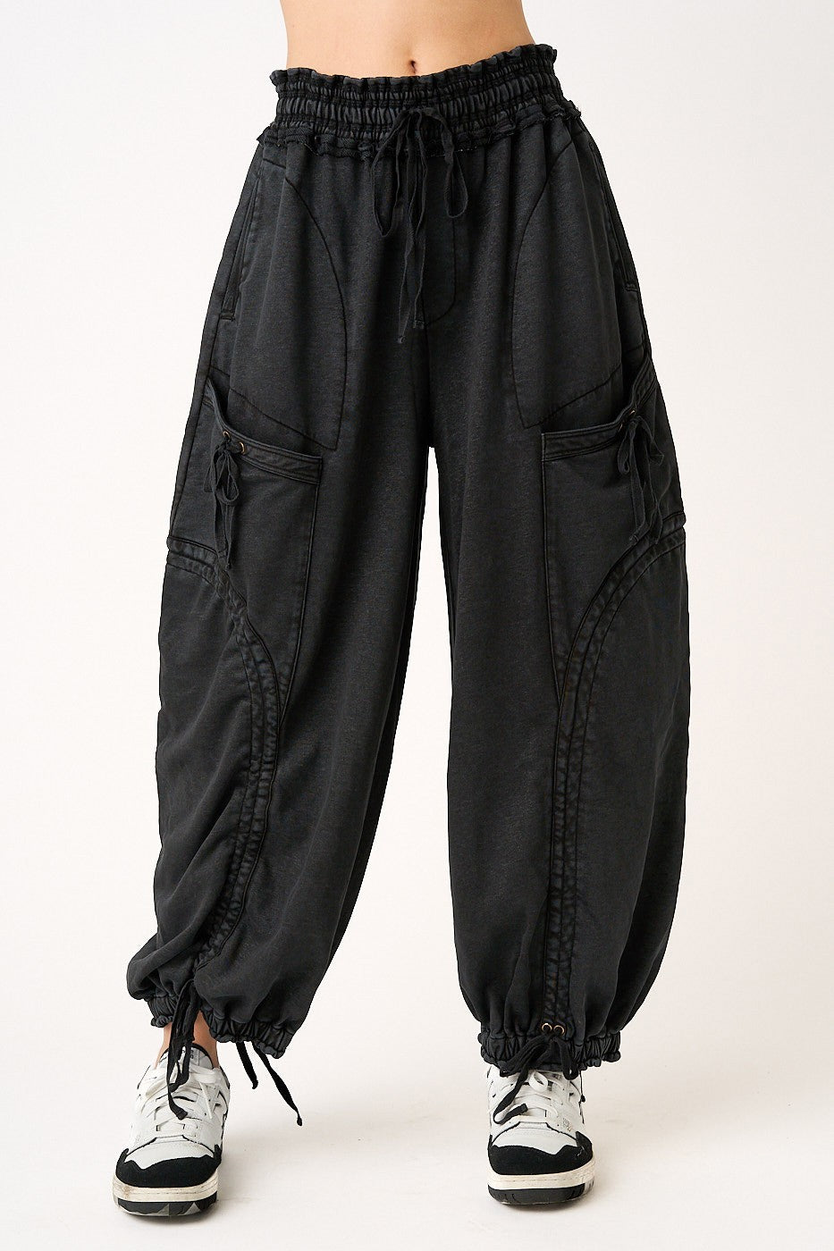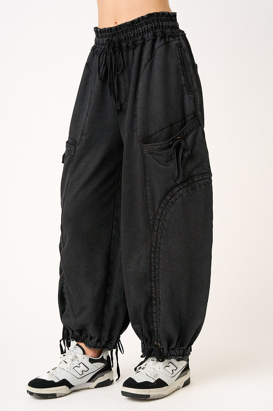 Soft, mineral-washed barrel joggers with sculpted seam work, oversized cargo pockets, and adjustable drawstring hems.