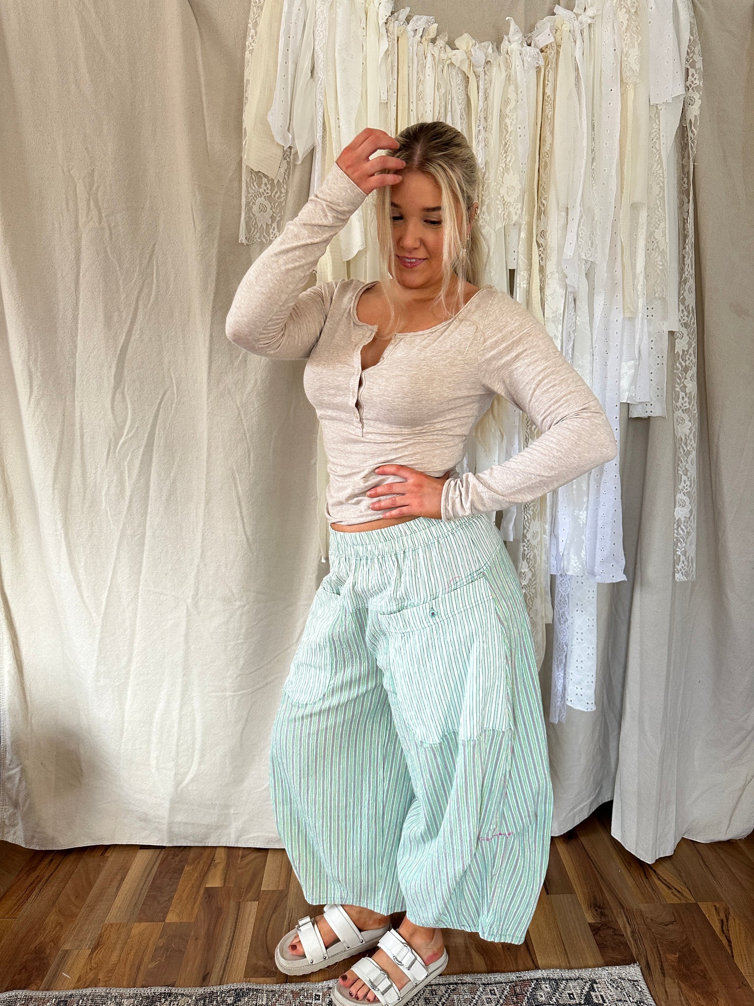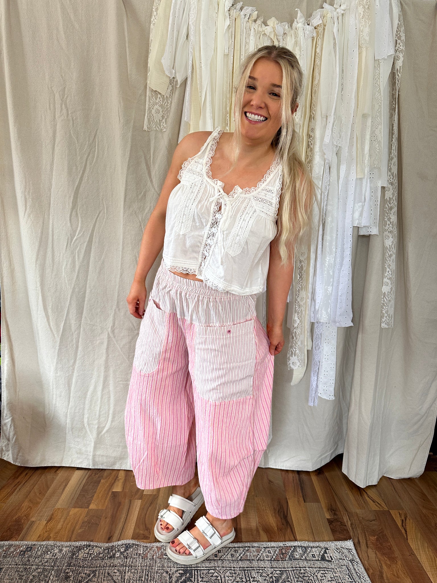 Meet the pant you’ll reach for on slow mornings and sunny afternoons. These Pant features lightweight breathable fabric with soft vertical striping and color block panel details for a relaxed, lived-in feel. 95% COTTON, 5% SPANDEX 100%COTTON
