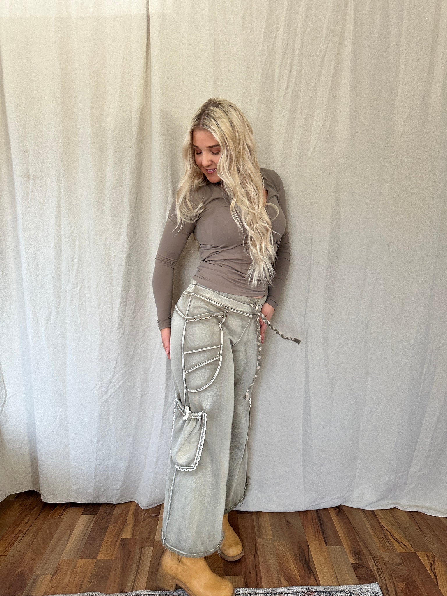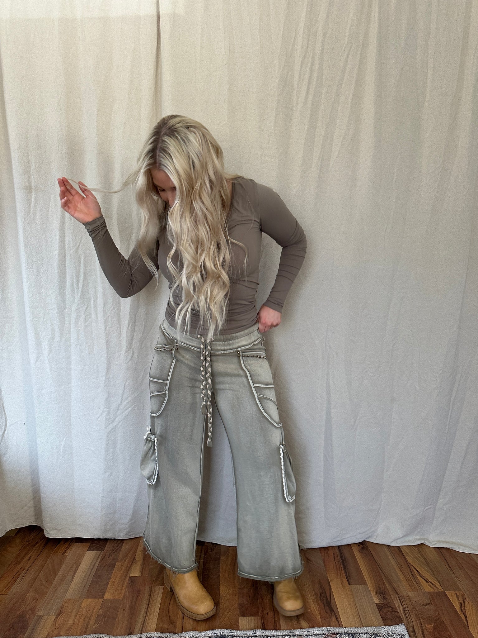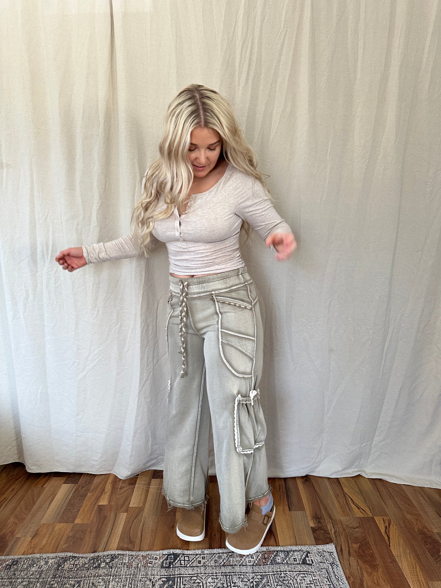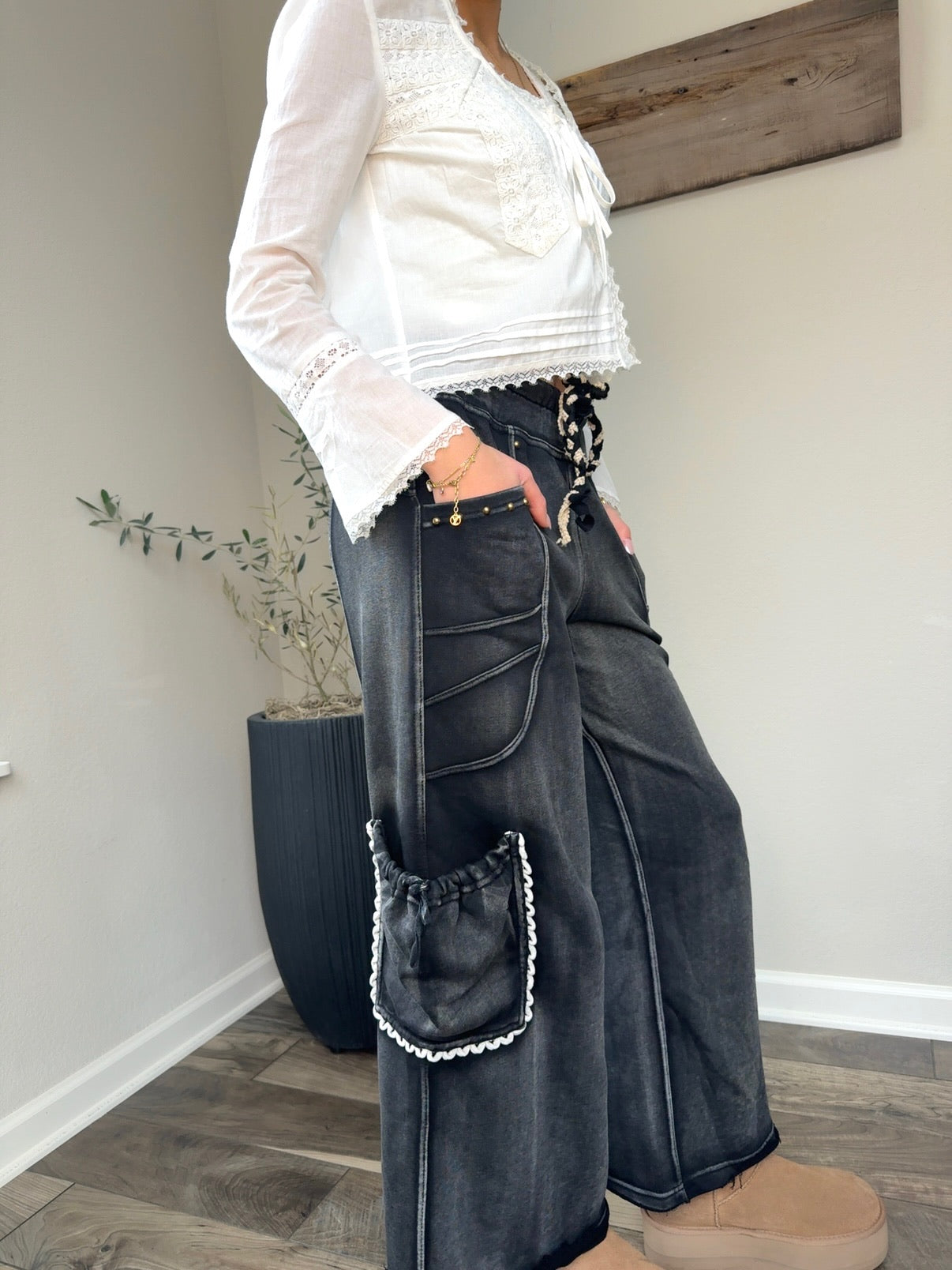 Crafted from soft French terry, these wide-leg pants offer a relaxed boho silhouette with cargo-style side pockets, stud accents, and braided drawstring details.