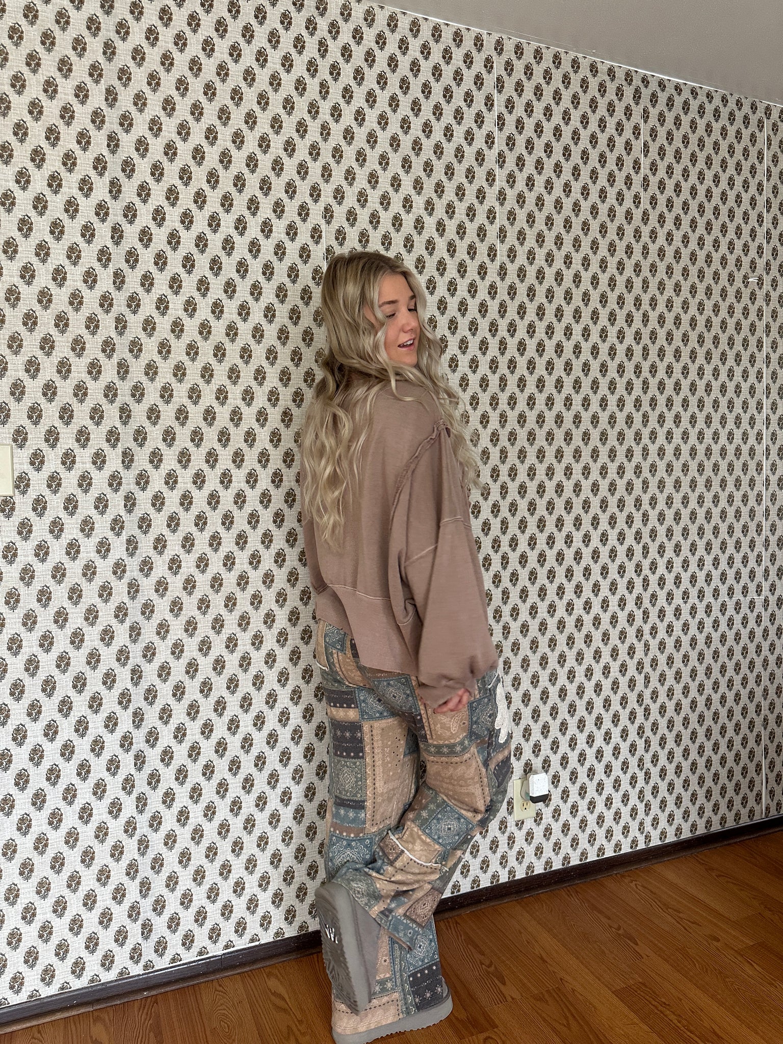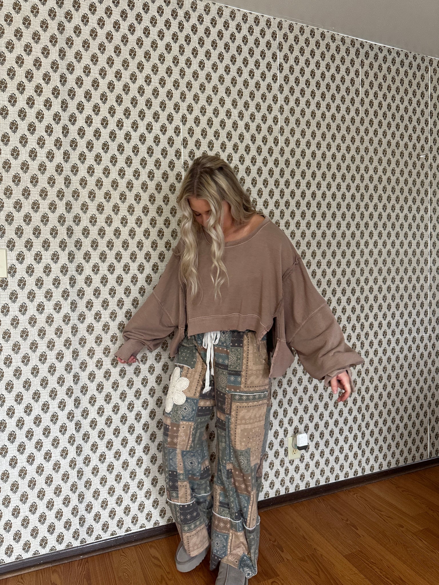 Playful patchwork lounge pants with pastel bandana blocks, a wide-leg fit, and a cute crochet flower detail, sweet, dreamy, and candy-coded cozy.