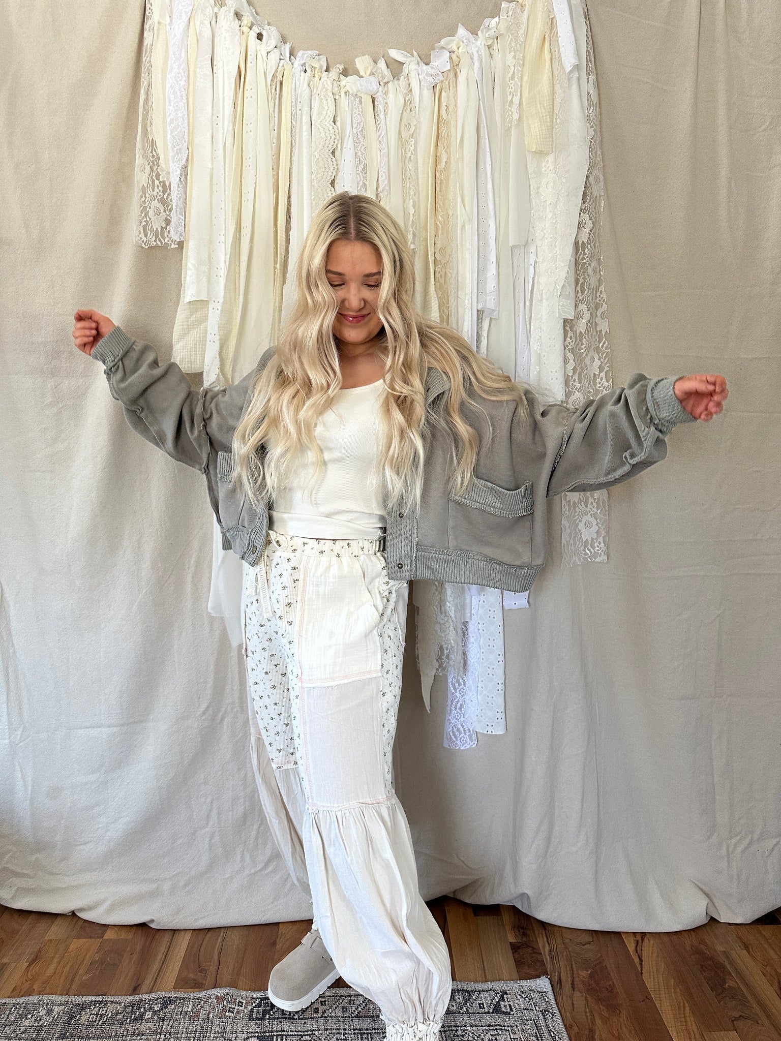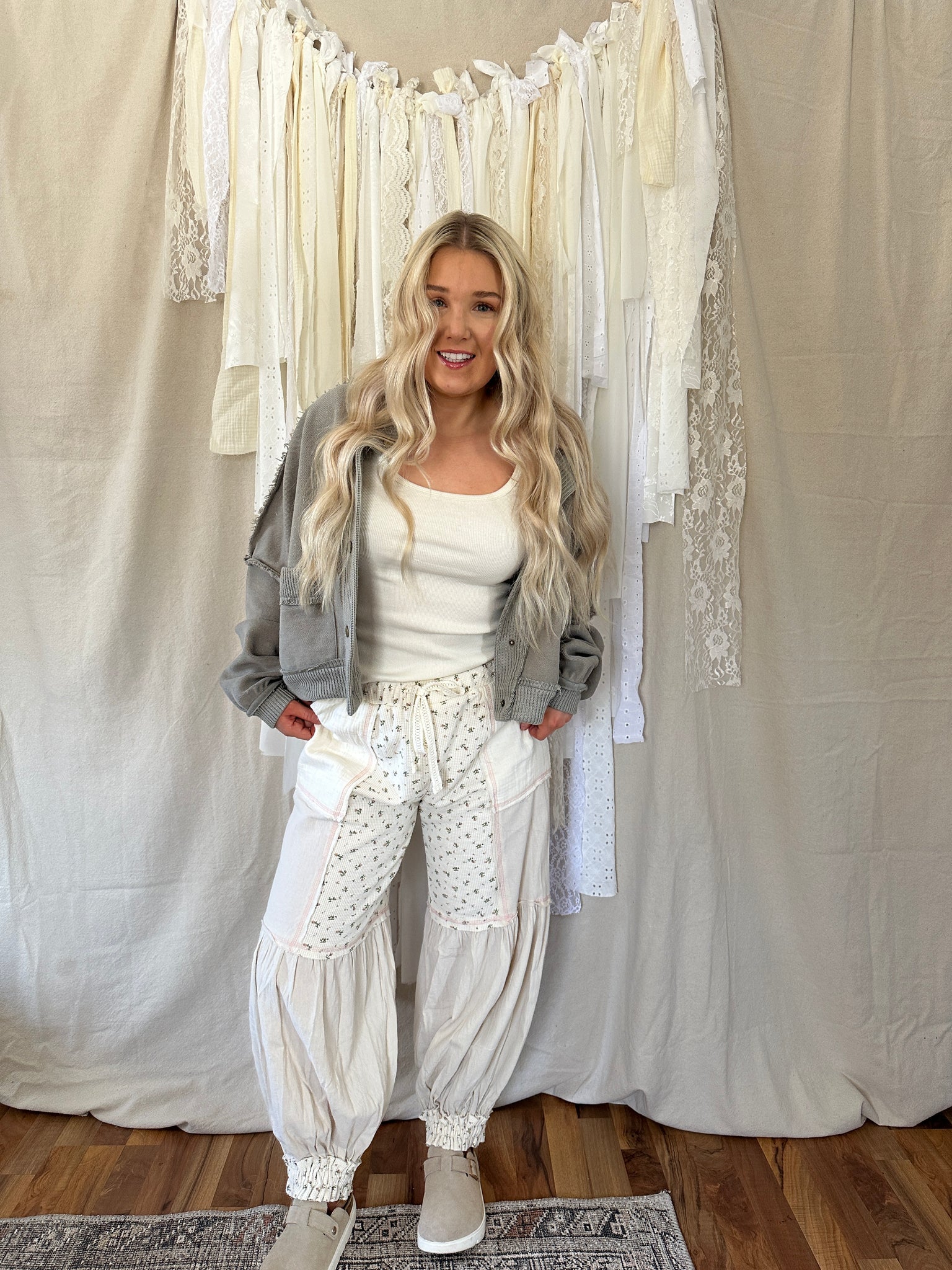 These boho patchwork pants feature mixed textures with soft floral panels, raw seam detailing, and an easy elastic waistband with adjustable drawstring. Lightweight and breathable with a vintage-washed feel, these are made for wandering, layering, and living in.
