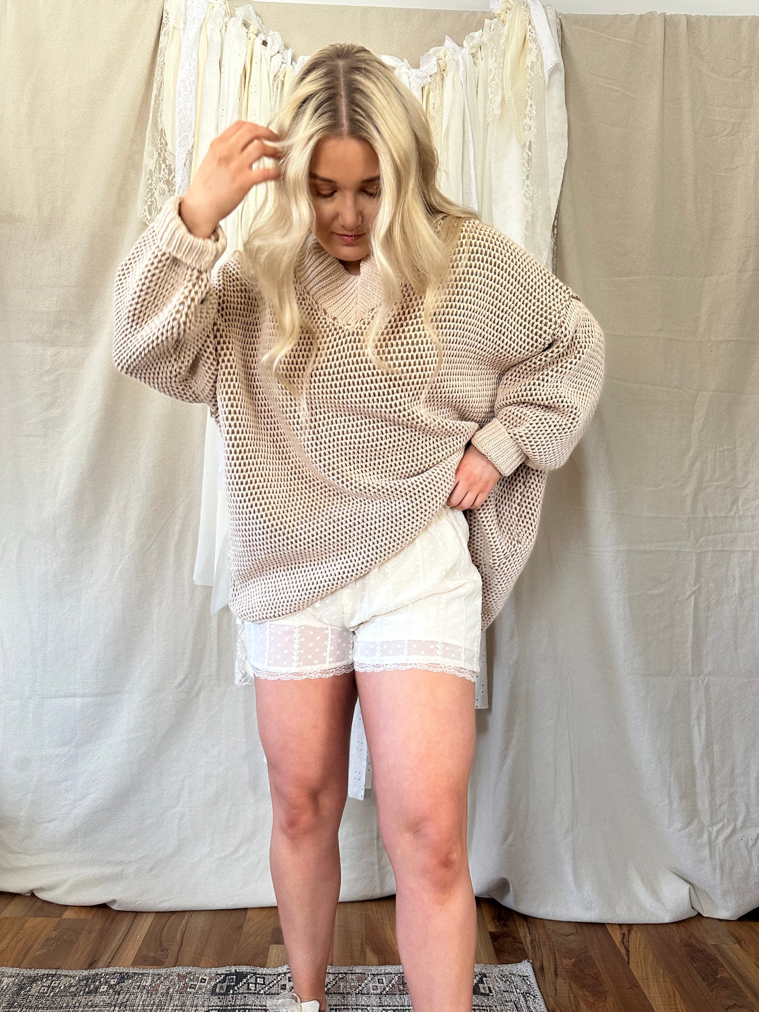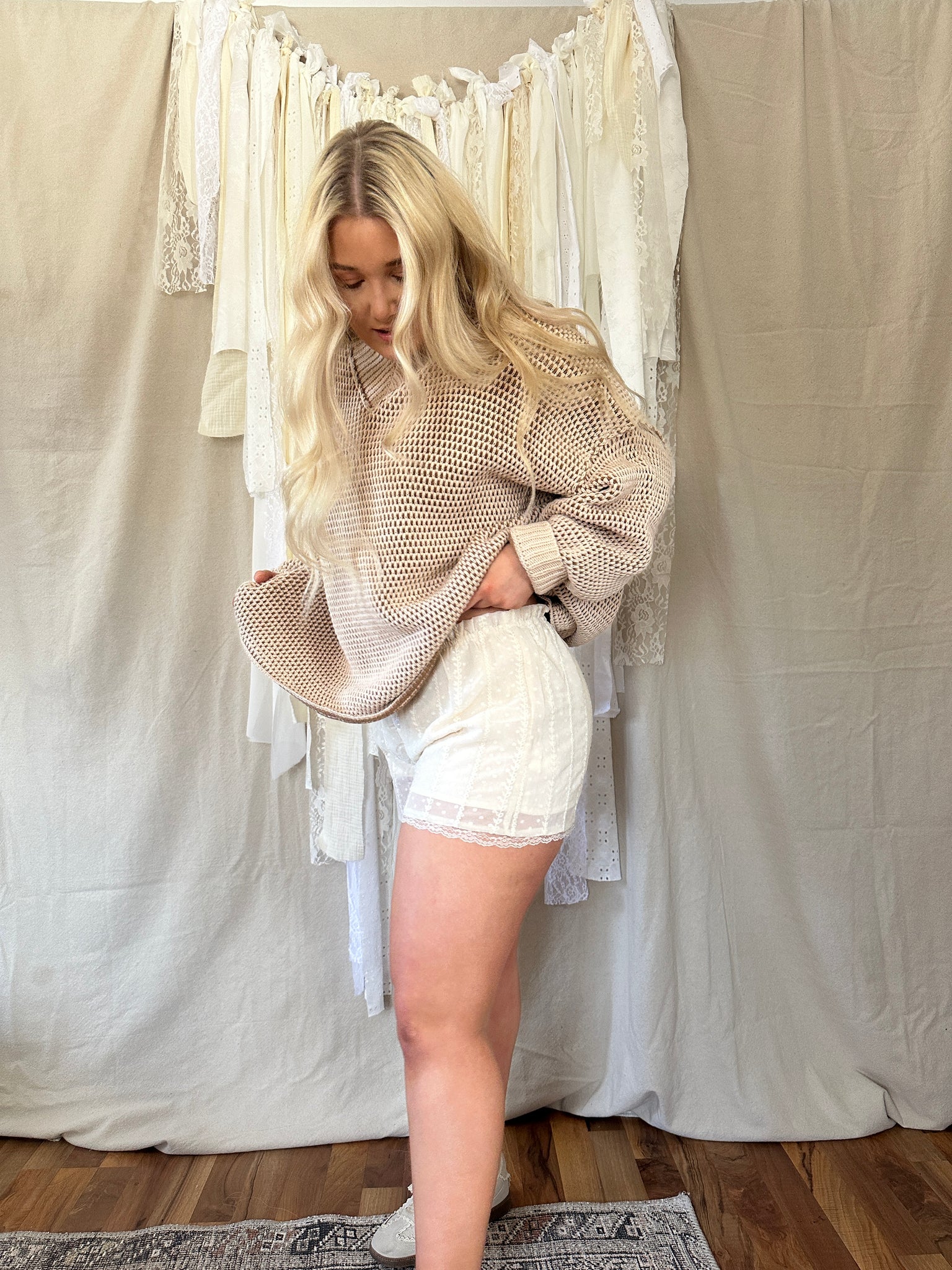 Soft, feminine, and effortlessly romantic. Designed with a comfortable elastic waistband, functional button front, and adjustable drawstring tie, airy and flattering with subtle movement.