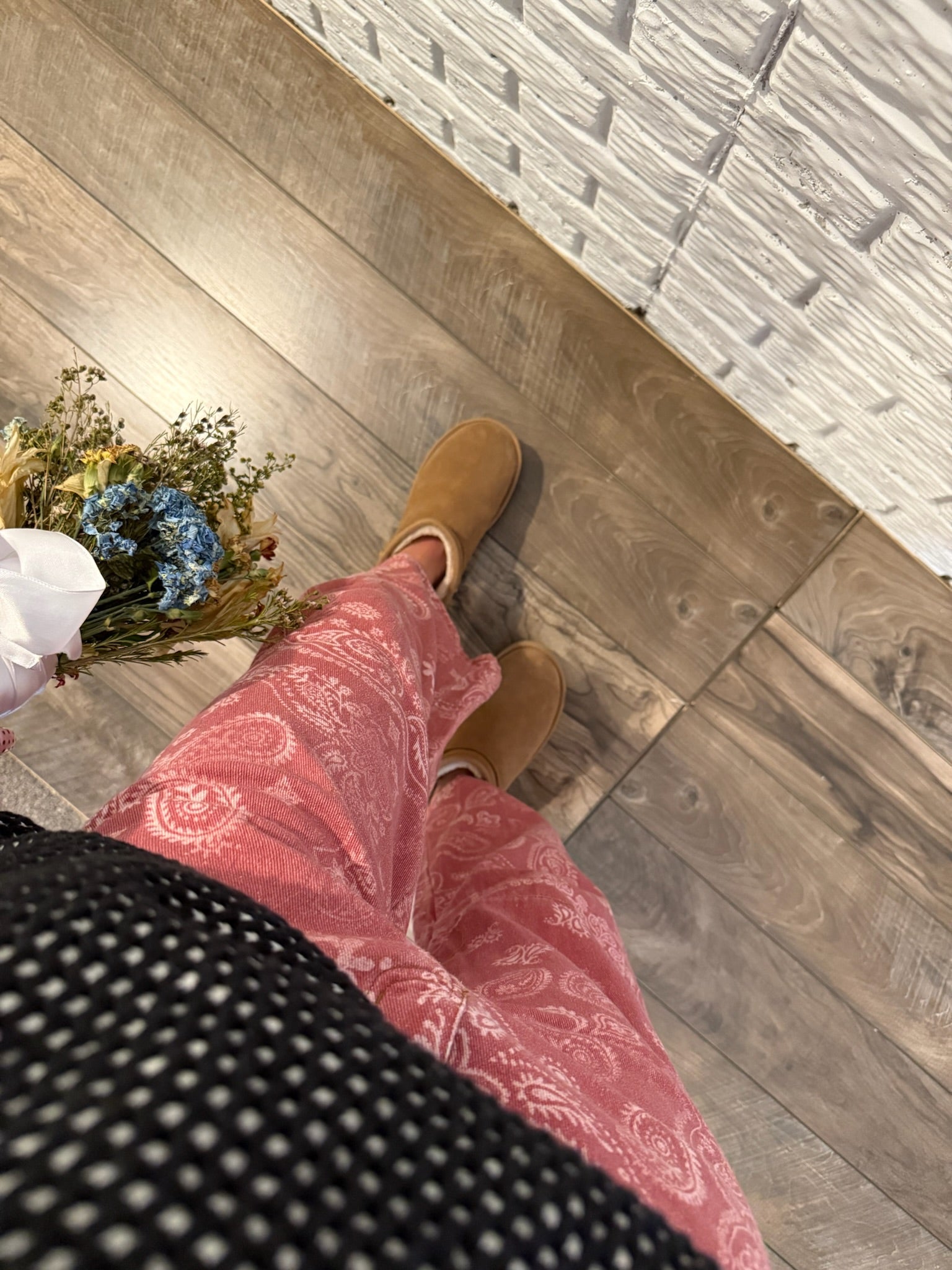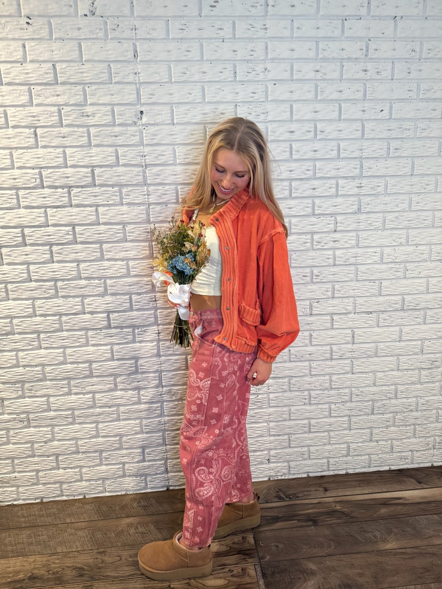 Slight Barrel Leg fit in a washed rose tone with an allover paisley bandana print.