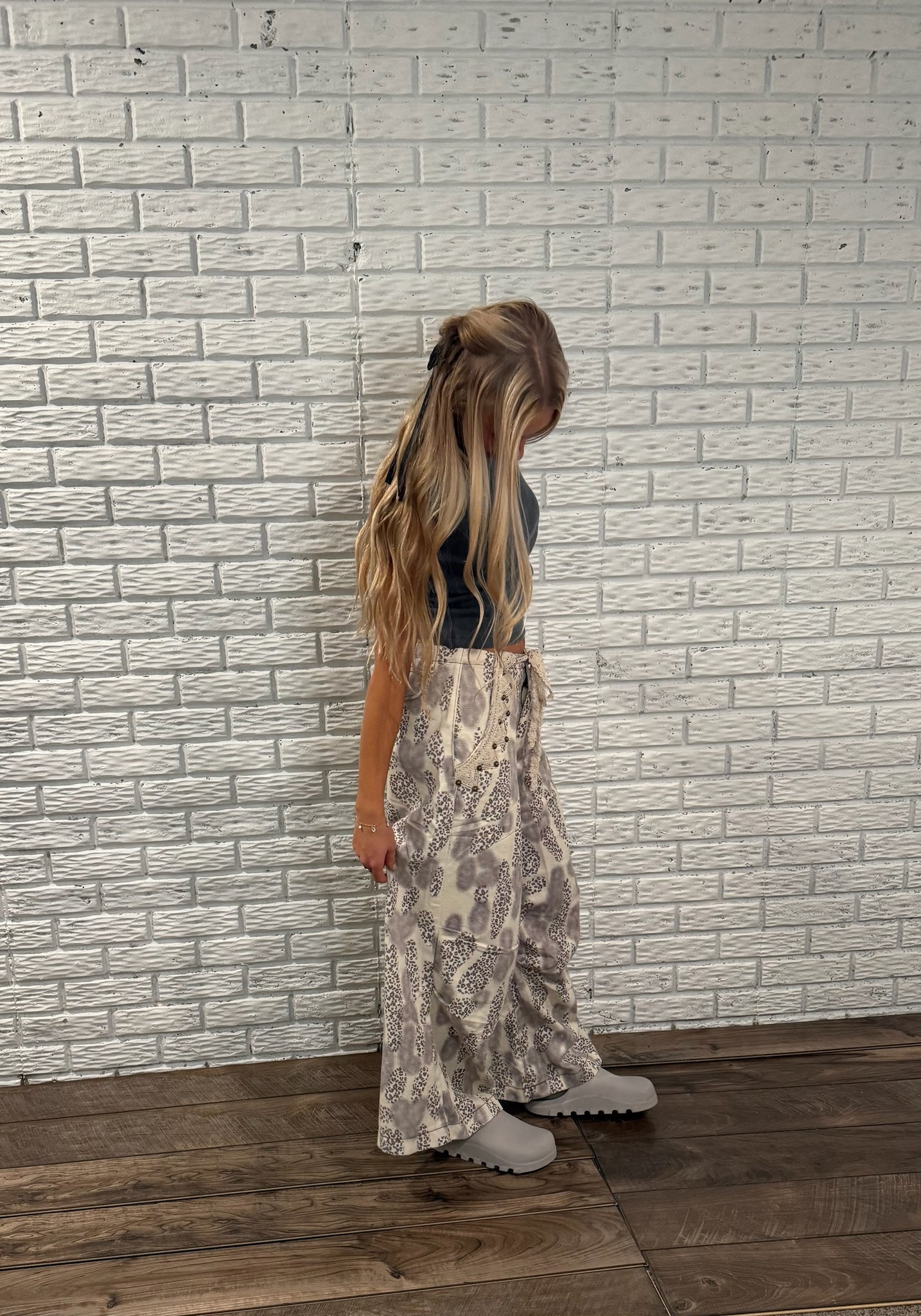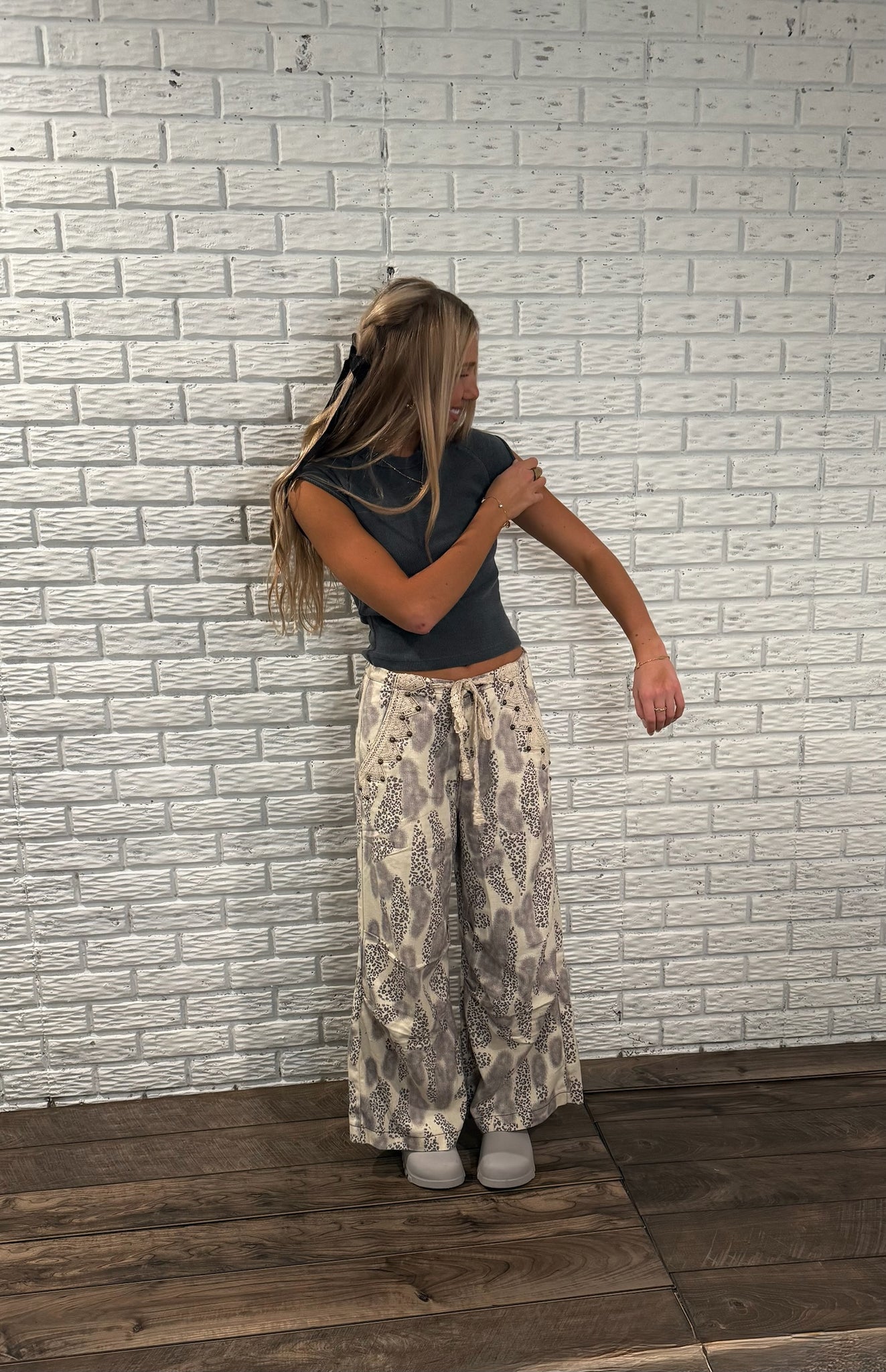 These pants are the kind that make people look twice. Designed in a soft wide-leg silhouette with a relaxed drawstring waist, they feature an abstract, almost animal-inspired print that shifts between neutral shades. 100% cotton