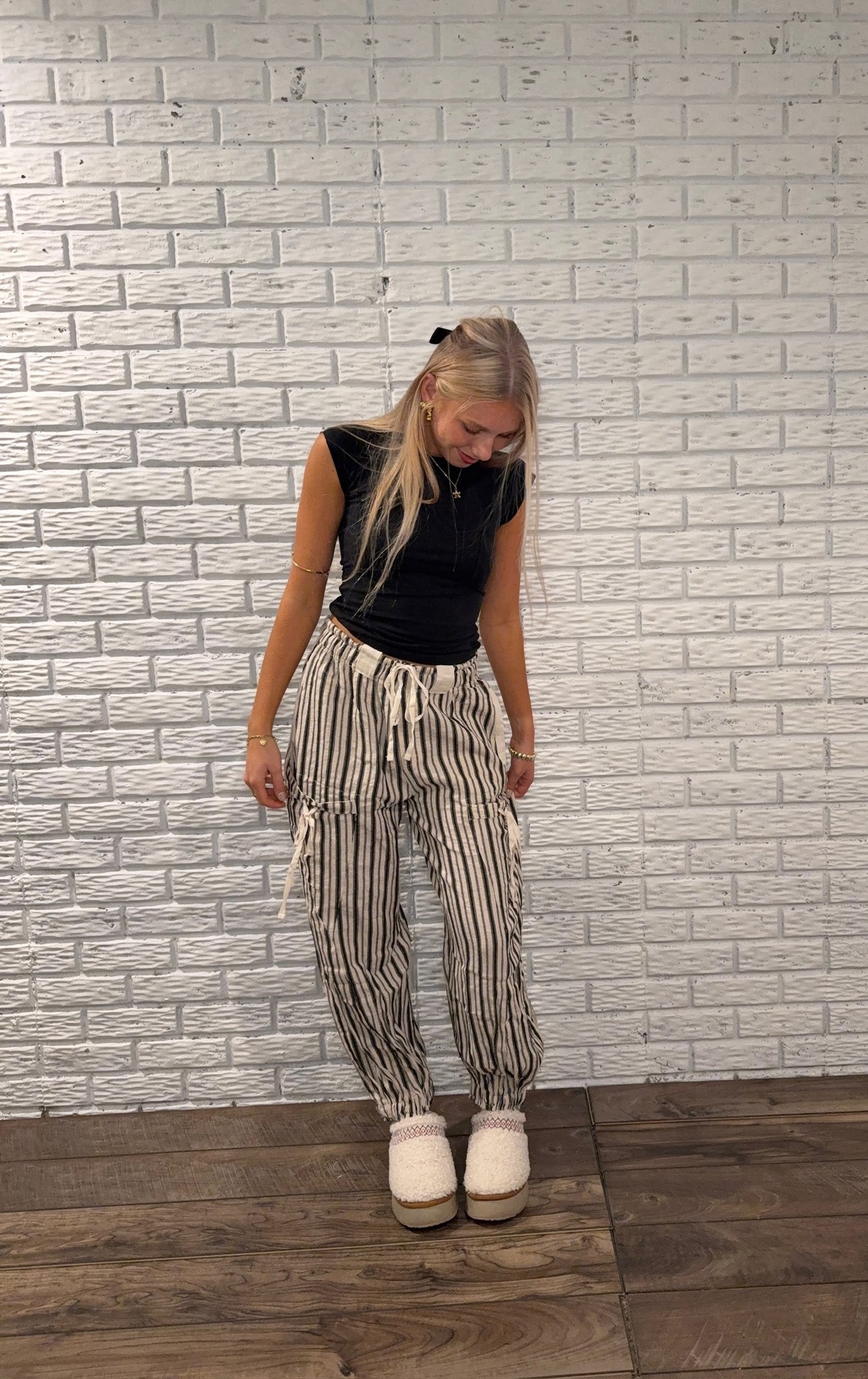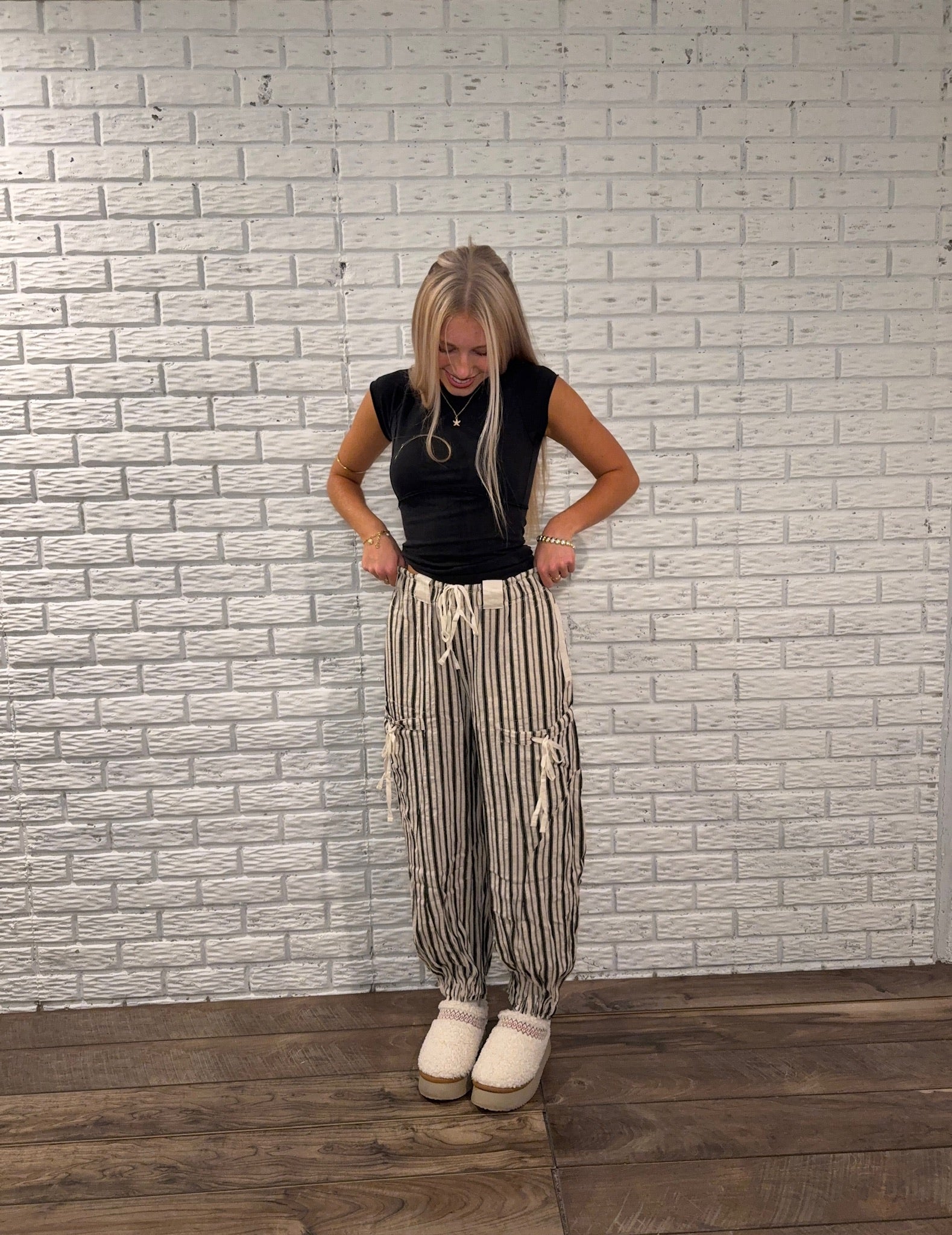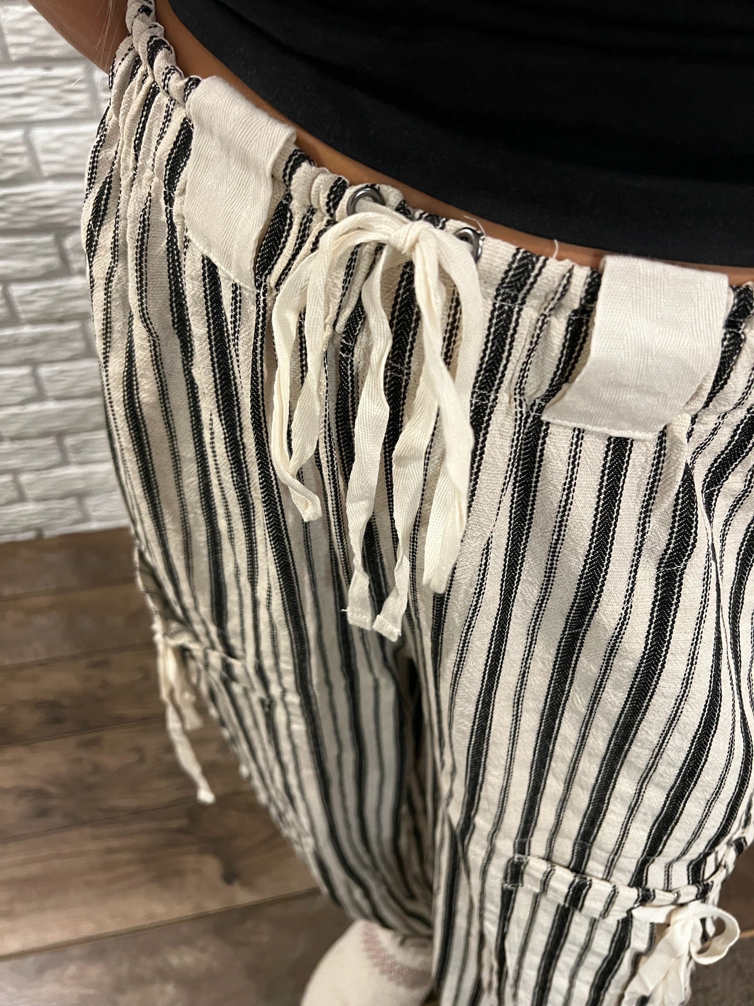Made with a soft, breathable striped fabric, they feature an easy drawstring waist, roomy cargo-style pockets, and adjustable ties along the legs for a slouchy, lived-in look.