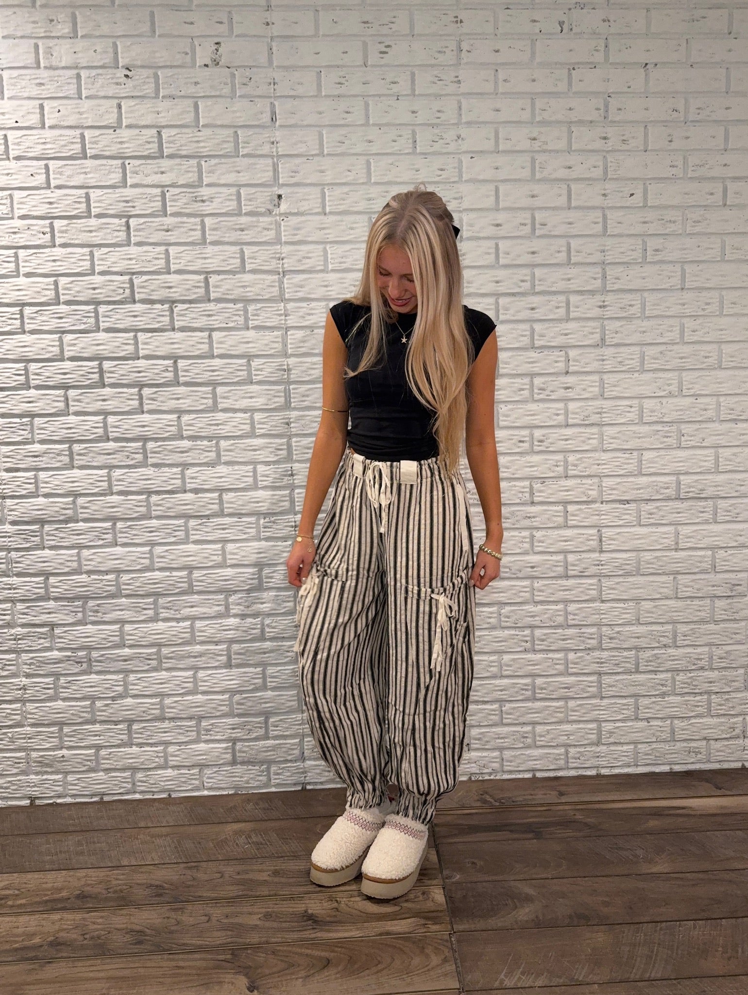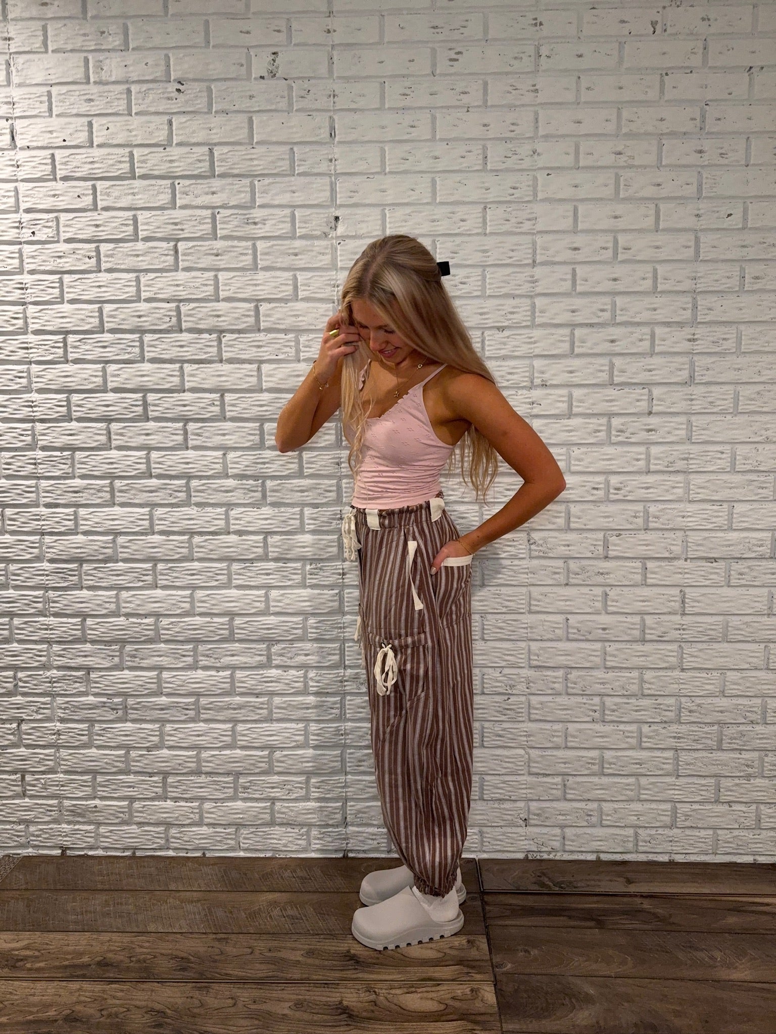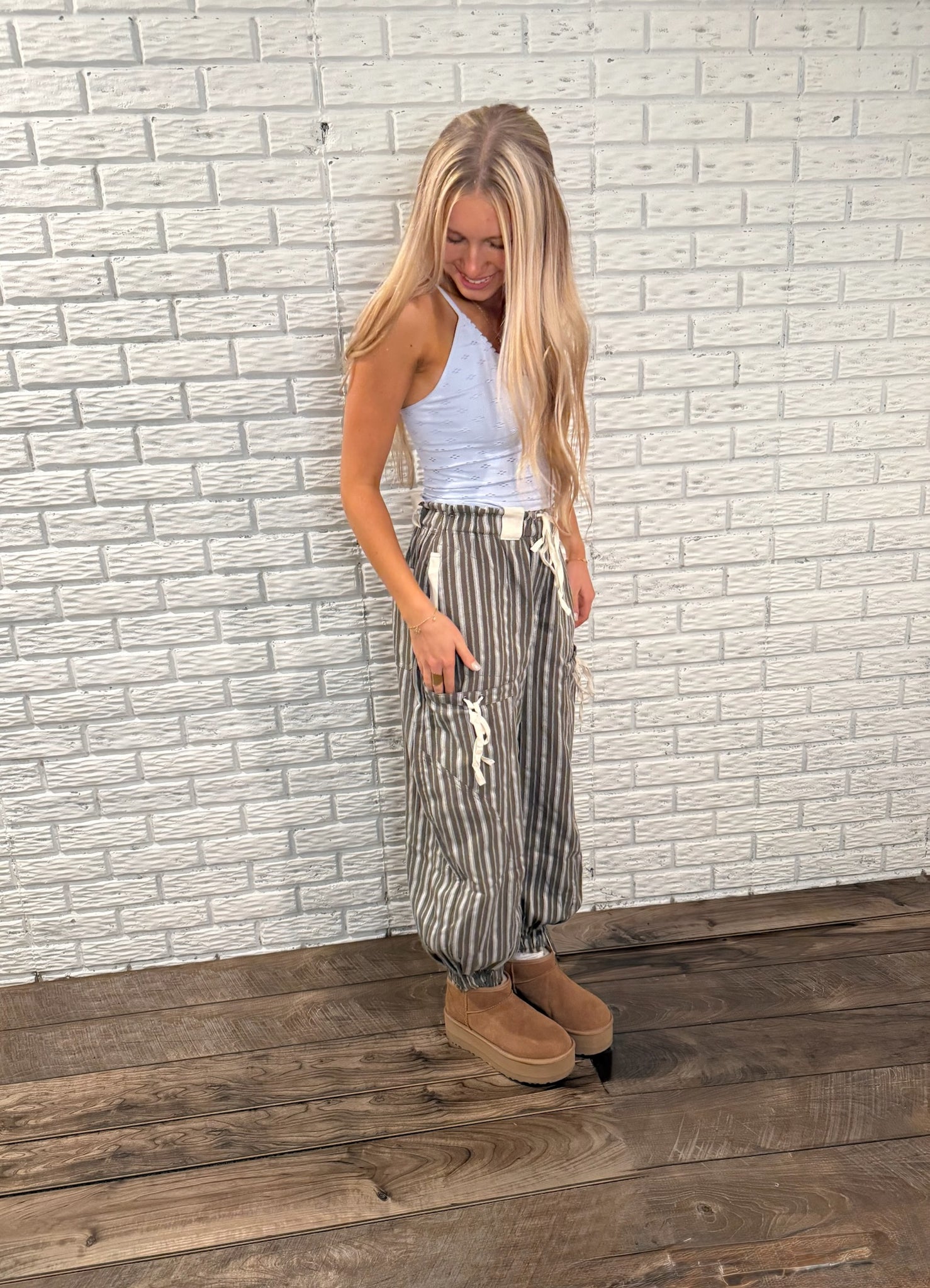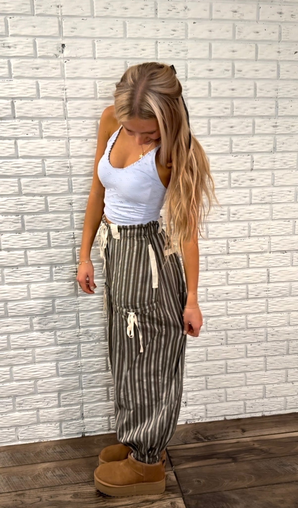 Made with a soft, breathable striped fabric, they feature an easy drawstring waist, roomy cargo-style pockets, and adjustable ties along the legs for a slouchy, lived-in look.