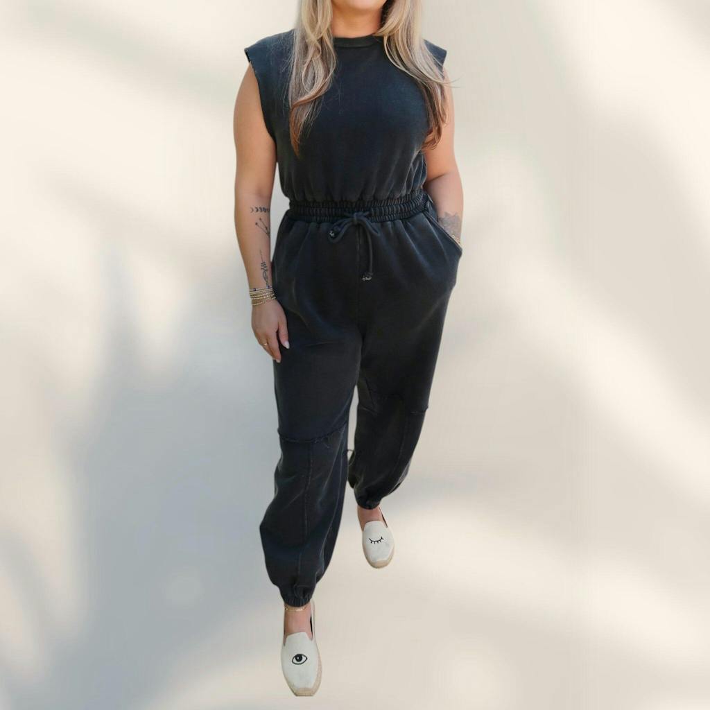 Cut off muscle tee jumpsuit -Self tie waist for adjustable fit -Fraying and distressed below the knee detail -Heavy weight with 440g of 100% cotton -Features a keyhole back with a snap button -Attire Focus logo embroidery by the knee.